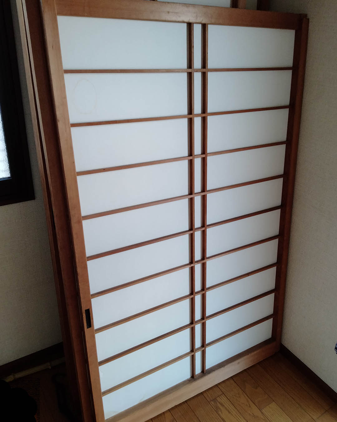 障子は幅80cm高さ178cm、二枚の引き違い窓のものを横にして利用。